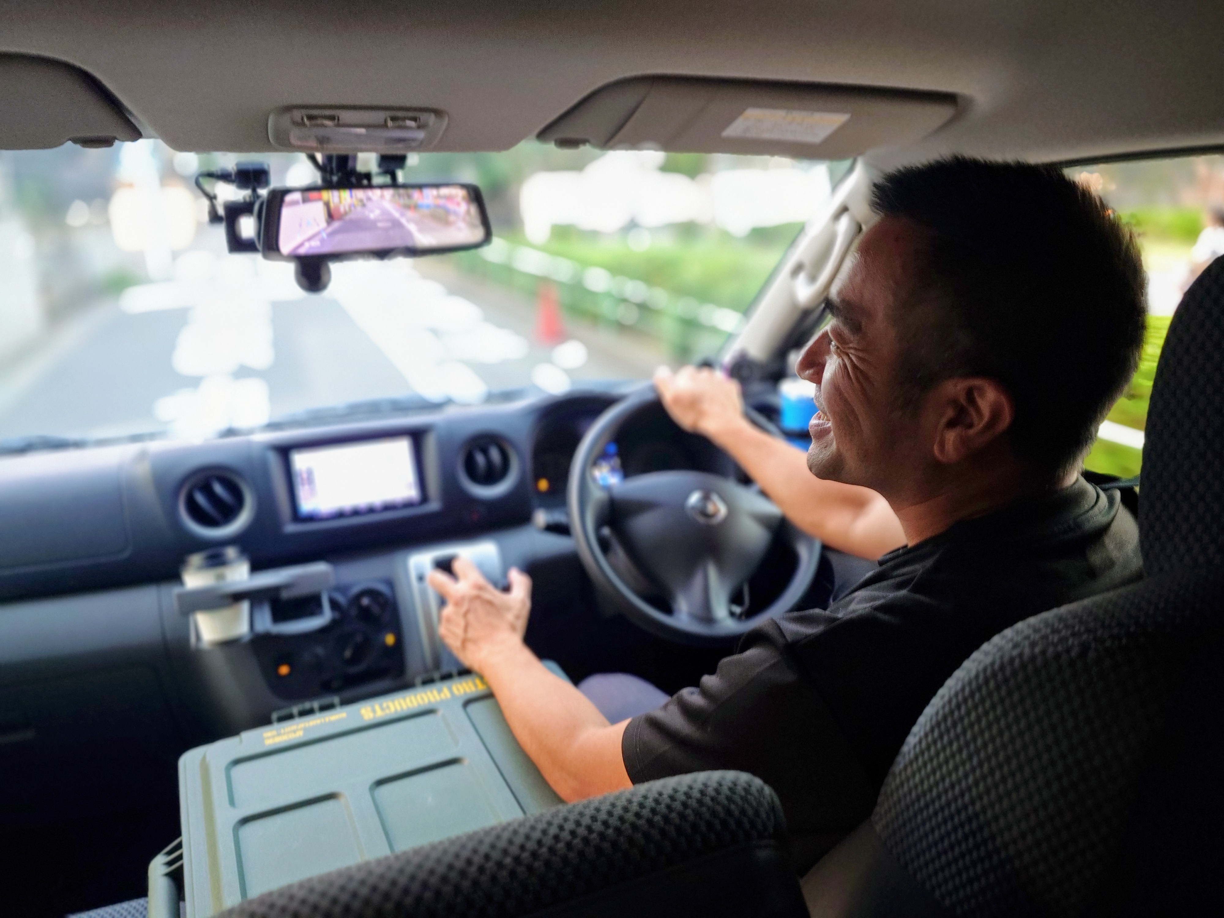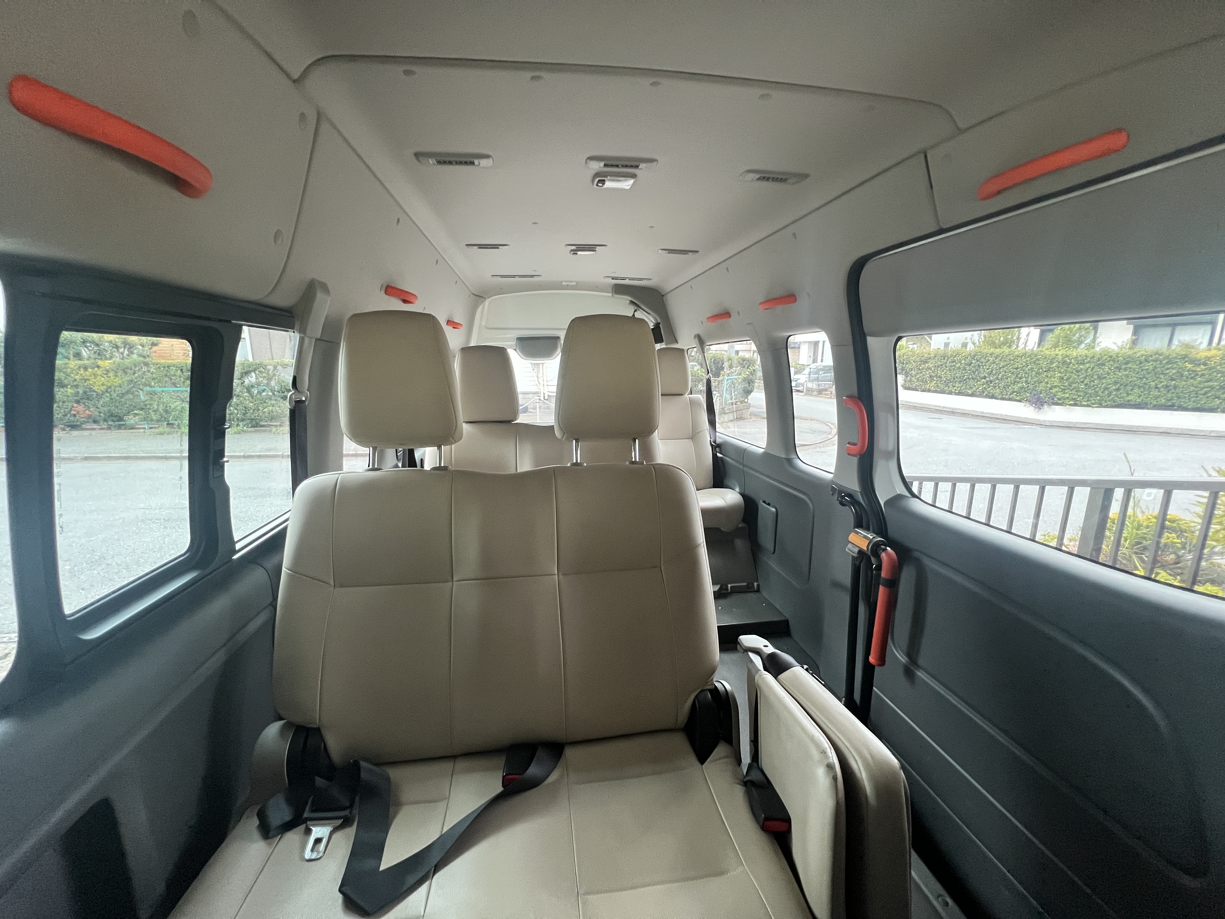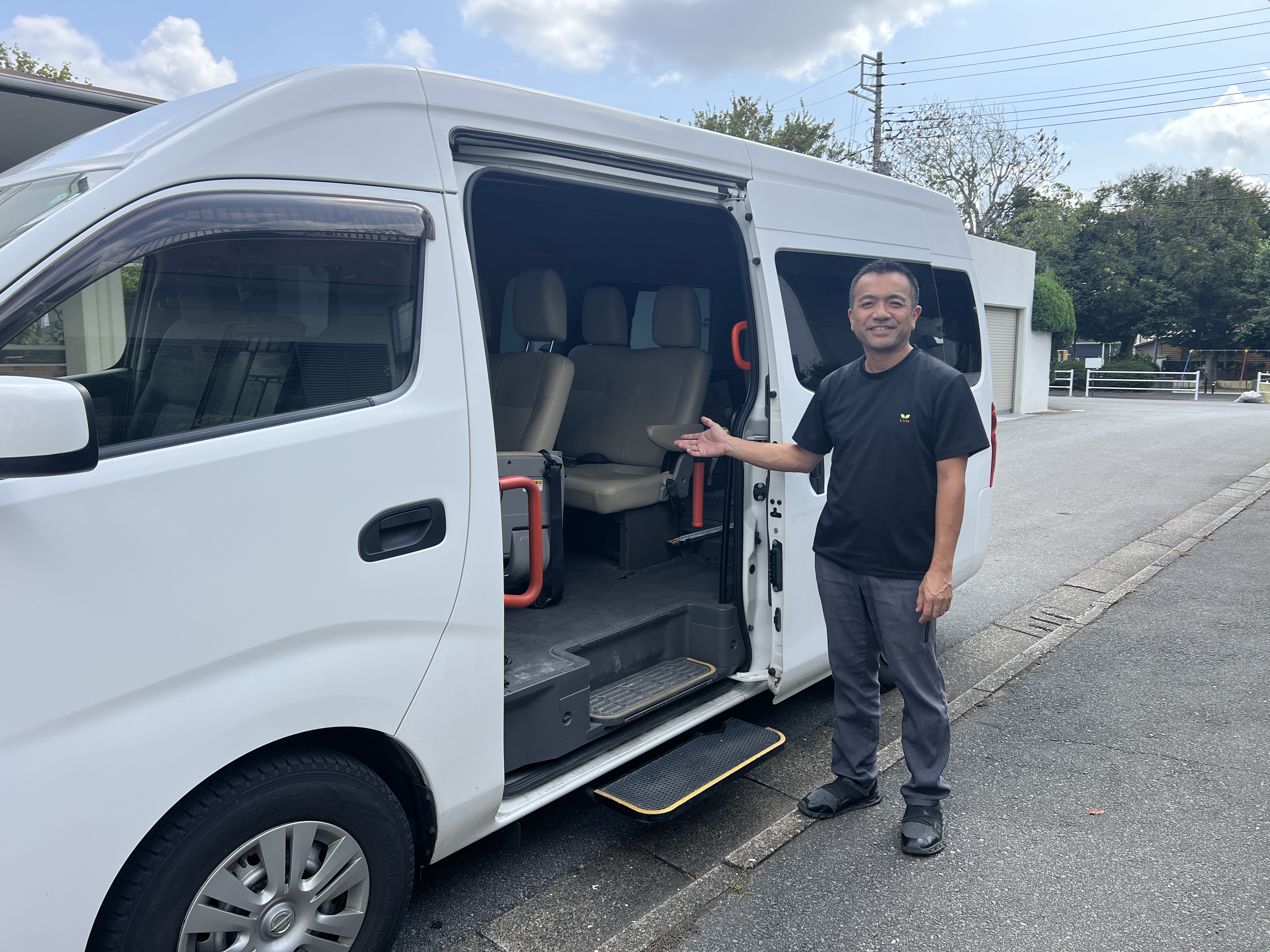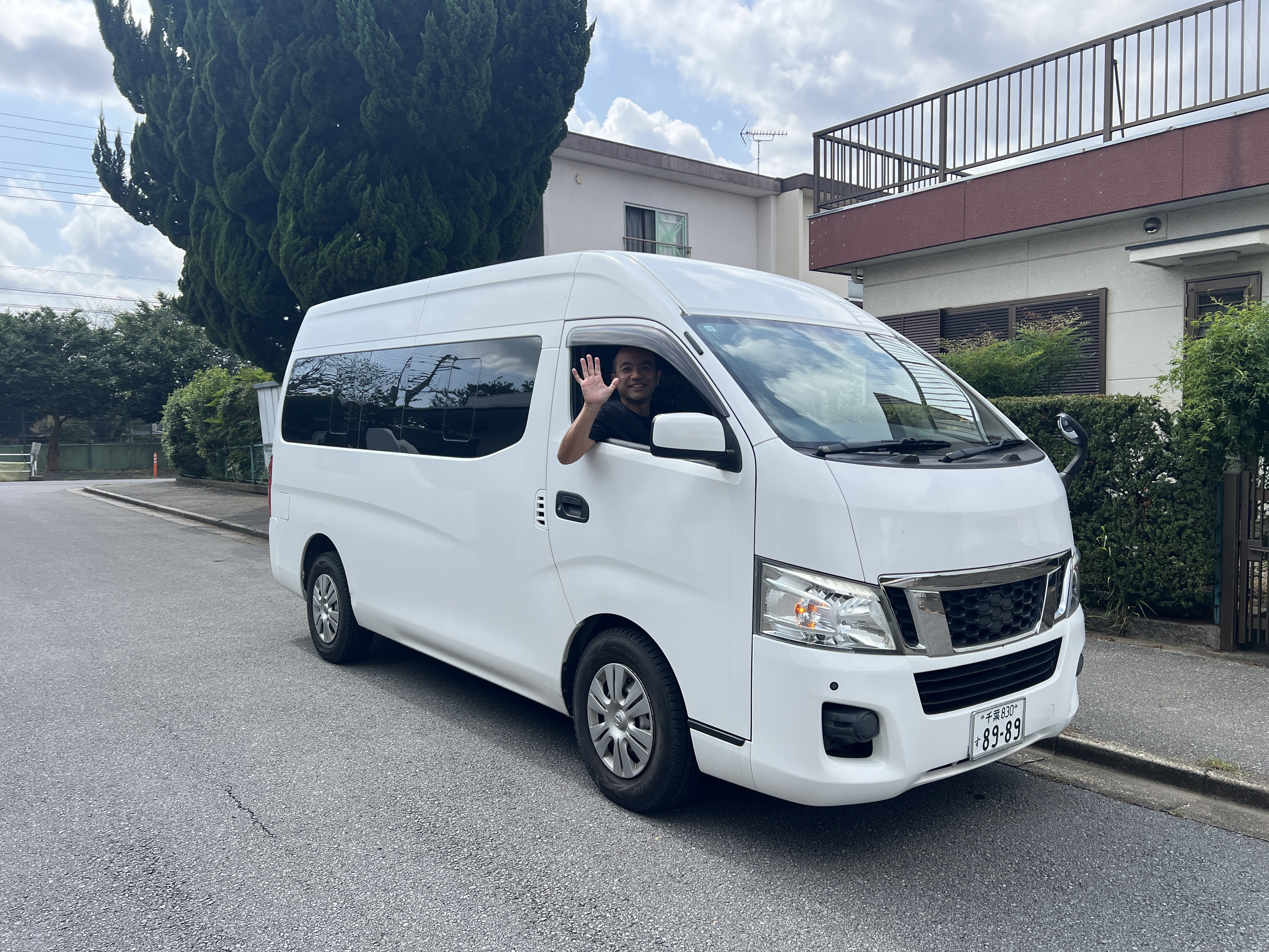 ナンバー「89-89」の白のバン(日産キャラバン)にご乗車ください。